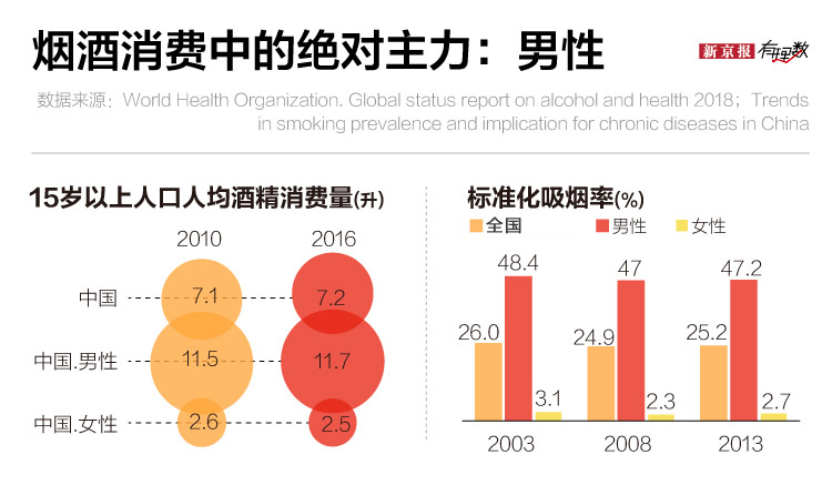 无论是在吸烟者还是在饮酒者中,男性都是绝对的多数派。世卫组织报告估算,2016年中国15岁以上人口中,男性人均酒精消费量约为11.7升,而女性仅为2.5升。最新的研究数据,2013年中国男性中吸烟者比例为47.2%,而女性仅为2.7%。