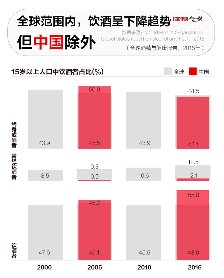 今年9月份,世界卫生组织发布《全球酒精与健康报告2018》,报告指出,在全球范围内,人均饮酒呈下降趋势,但中国人均酒精消费量增加,戒酒率下降。中国人均酒精消费量在2005年、2010年和2016年分别为4.1升,7.1升和7.2升,增幅76%。