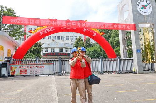 国网闽清县供电公司增派共产党员服务队,专派保电车辆,设立爱心服务点,并在重要保电线路安排专职人员轮班实行24小时蹲守,为考场提供全天候保电服务。