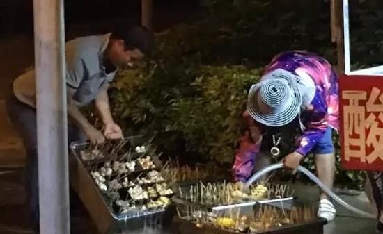 网友“峰呀风”说,当时,他看到一个流动摊点停在路边,摊贩从车上把两个装满食物的铁锅卸下来,倾斜倒去里面的沸水。随后,摊贩从绿化带中接出一根水管,往铁锅里注水。