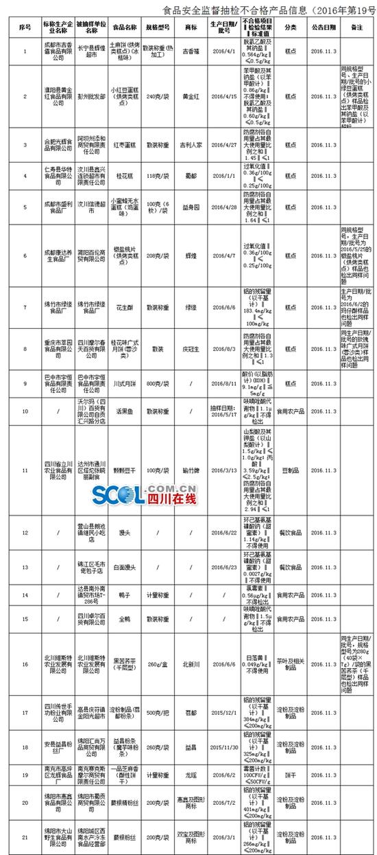 四川在线消息(记者 周伟)11月3日,省食药监局公布了今年第19批食品安全监督抽检信息,结果显示,在该局近期抽检的食用农产品、饼干、餐饮食品、茶叶及相关制品、炒货食品及坚果制品、蛋制品、淀粉及淀粉制品、豆制品、糕点等共计9类、751批次食品中,抽样检验项目合格样品725批次,不合格样品26批次。