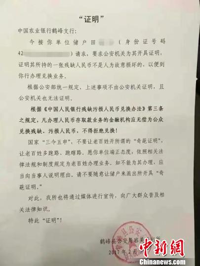 中新网湖北鹤峰2月4日电 (董晓斌 钟欣)4日,一份盖有湖北鹤峰县公安局容美派出所公章的“证明”文件在网络热传。该“证明”落款时间为2017年2月3日,其内容显示,中国农业银行(3.180, -0.03, -0.93%)鹤峰县支行的储户田某被要求公安机关为其开具证明,证明其所持一张残缺人民币不是人为故意损坏,以便到该行办理兑换业务。