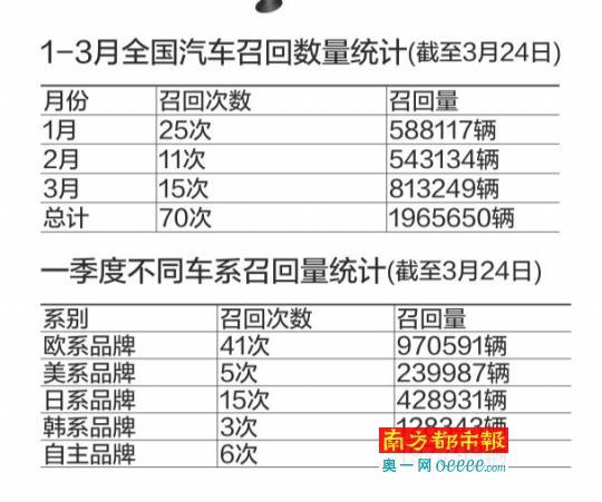 截至3月24日共发布70次召回公告涉及车辆196.6万辆,欧系车占近半