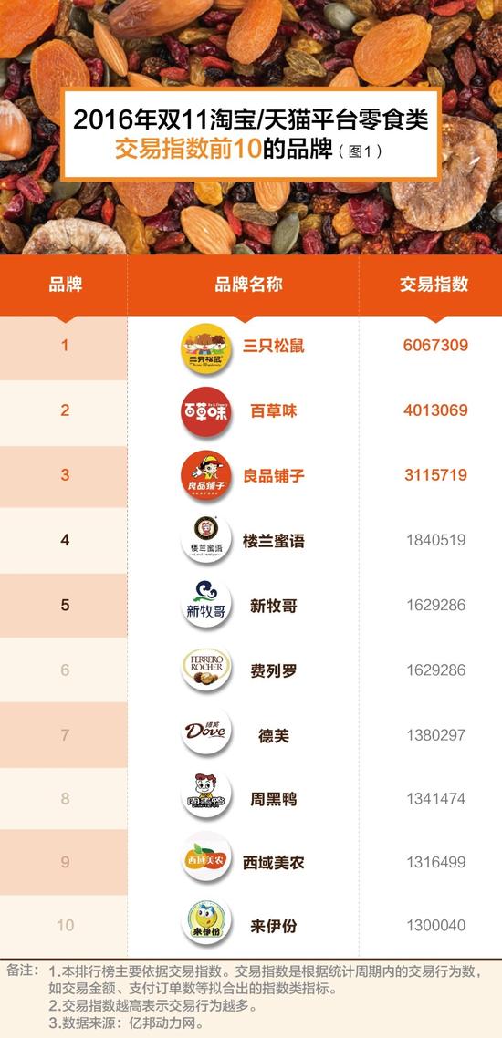从2016年双11零食销售排名榜单上看,坚果炒货、预包装肉制品、巧克力等三类最受消费者欢迎。更引人注意的其次则是三只松鼠、百草味、良品铺子等坚果类三驾马车,其交易指数一骑绝尘,均突破300万占据了零食交易的半数以上。(如图1)