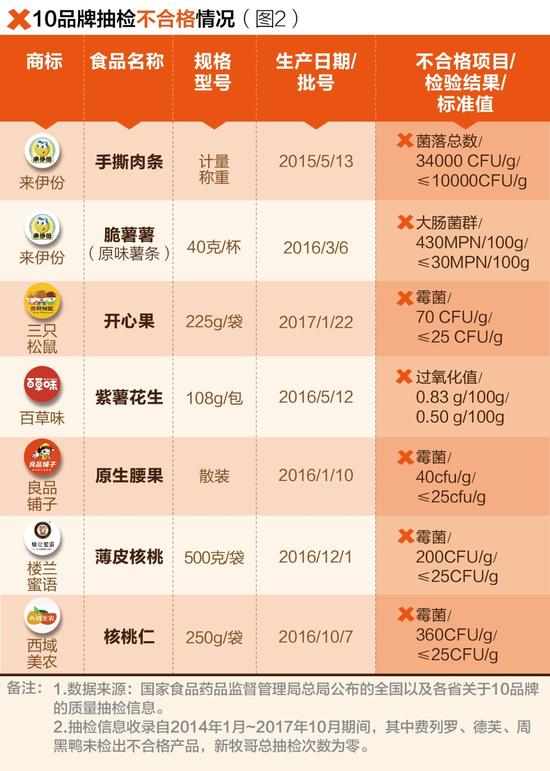 值得注意的是,以上抽检数据中来伊份不合格次数多达2次,而其余的5品牌上“不合格黑榜”均为1次。