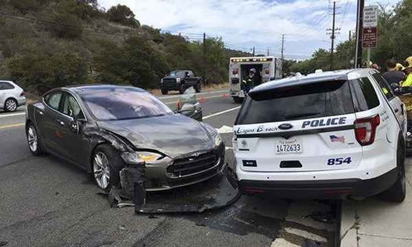 特斯拉将停在路边的警车撞报废,司机称当时处于自动驾驶模式