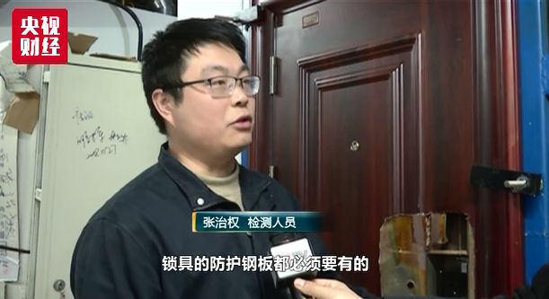 检测人员 张治权:从防盗门的要求来说,不管是哪个级别,锁具的防护钢板都必须要有的,它现在连这个都没有。