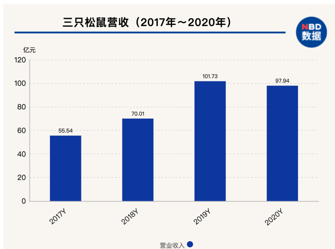 2017年-2020年,三只松鼠的营业收入分别为55.54亿元、70.01亿元、101.73亿元和97.94亿元;归母净利润分别为3.02亿元、3.04亿元、2.39亿元和3.01亿元。