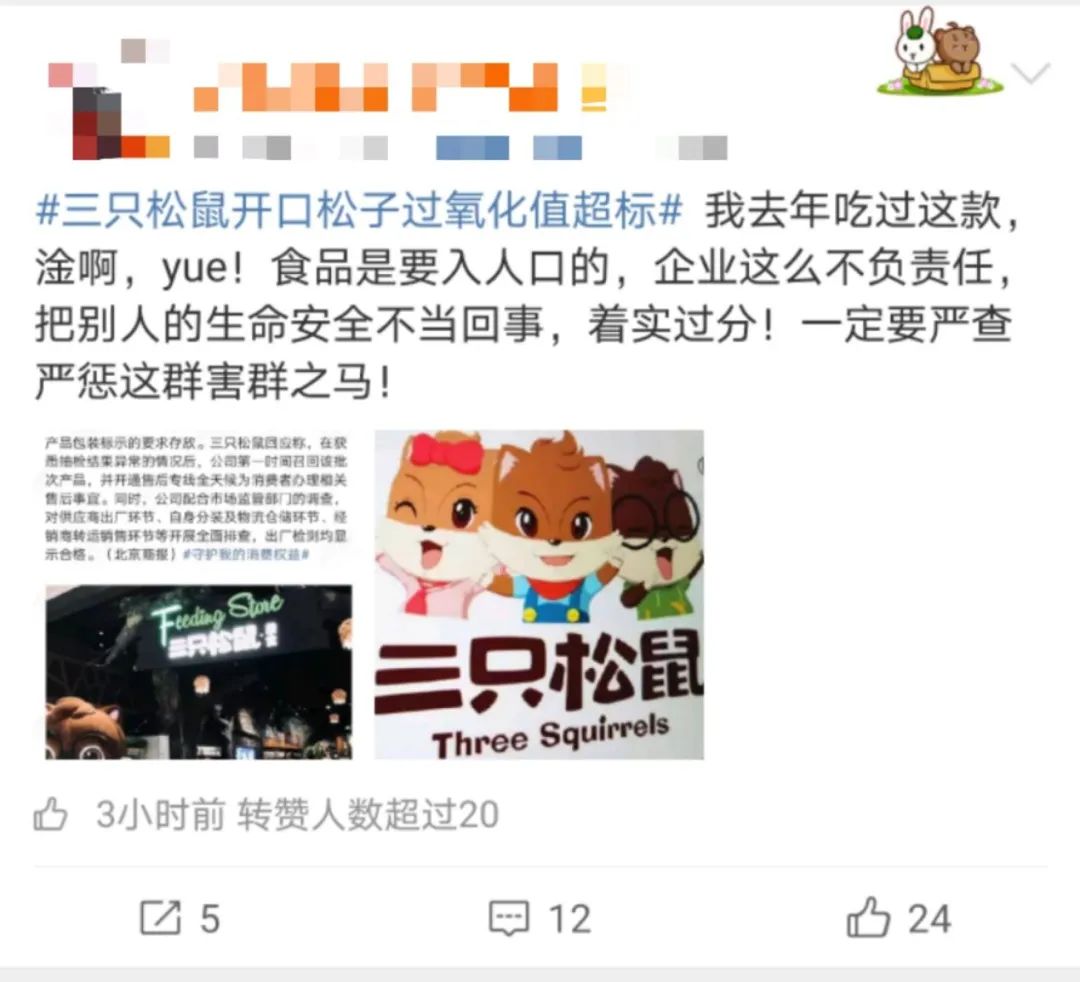 近日,市场监管总局网站发布信息显示,三只松鼠开口松子过氧化值超标,引发大众舆论并一度冲上微博热搜。不少网友怒斥,这是不把生命安全当回事;也有网友担心,三只松鼠的其他食品是否还能安全食用。