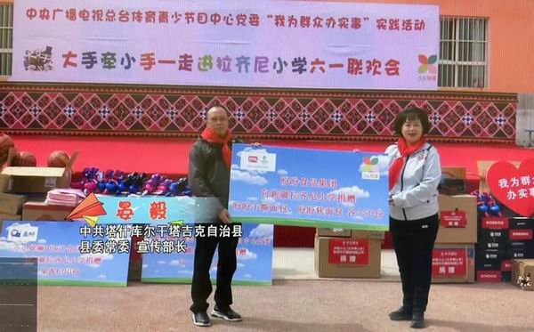 来到这所以英雄命名的小学,不仅有央视主持人,还有来自祖国东南沿海地区的盼盼食品集团。为了满足拉齐尼小学师生的六一心愿,盼盼食品集团捐赠了手撕面包、软面包各350份。