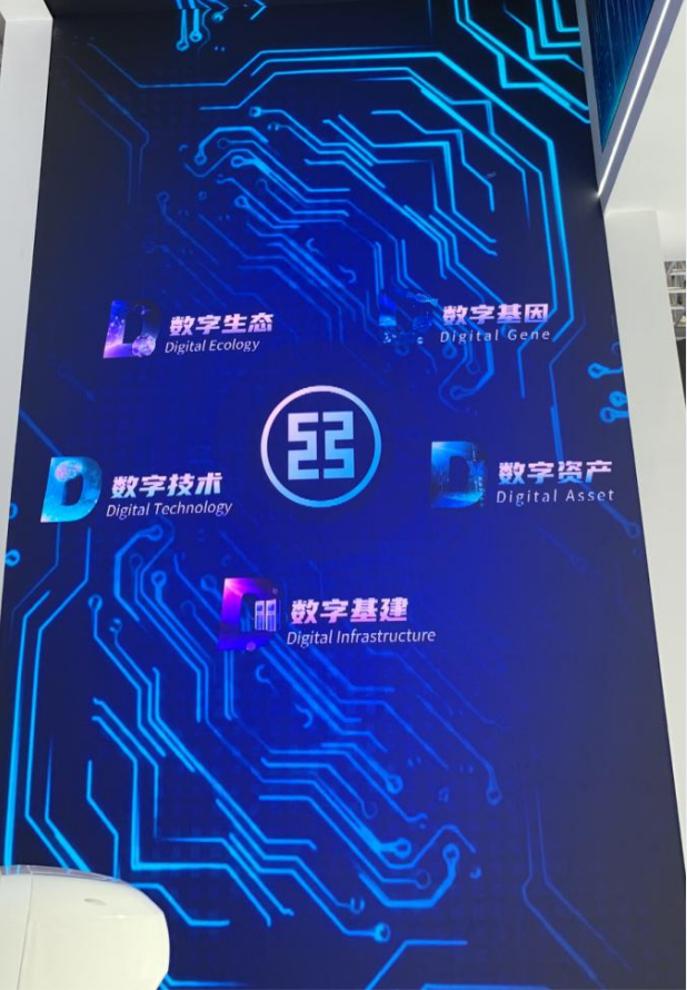 工商银行在“数字工行”板块展出今年年初推出的全新集团数字化品牌“数字工行(D-ICBC)”,其中D(Digital)代表“数字生态、数字资产、数字技术、数字基建、数字基因”五维数字化整体布局。工行将秉承数字化发展理念,加速业务模式及管理模式的创新,提升价值创造能力及用户服务水平,以服务实体经济和人民群众为目标,全面开启数字工行新征程。