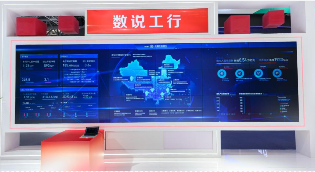 数字经济时代,工商银行通过金融科技与行业场景深度融合,推动了向数字化、智能化、生态化的加速发展。本次工行展厅专门设置了“数说工行”板块,展现工行在服务实体经济、建设环境友好型银行、全球化布局等方面取得的建设成果。在服务实体经济方面,工行落实“六稳”“六保”要求,统筹安排投融资的总量、节奏和结构,不断提升金融服务的适应性、竞争力、普惠性,更好满足实体经济多样化的金融需求,2021年,境内人民币贷款新增2.12万亿元,增量创同期新高,制造业、科创等领域信贷规模保持市场领先。在建设环境友好型银行方面,工行始终坚持以绿色金融促进实体经济发展,优先保障绿色信贷等重点领域投放,截至2021年末,绿色产业贷款余额达2万多亿元,绿色信贷支持项目减排二氧化碳当量近亿吨。在全球化布局方面,工行坚持国际视野、全球经营,深入实施外汇业务首选银行战略,在49个国家和地区建立了421家境外机构,在“一带一路”沿线21个国家拥有125家分支机构,推出工银全球付跨国支付结算服务,网上银行、手机银行等线上渠道服务覆盖46个国家和地区,服务网络覆盖六大洲和全球重要国际金融中心。