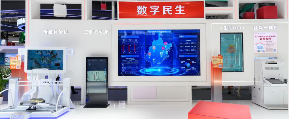 “数字民生”板块展示工行在赋能乡村振兴、助力数字福建建设等领域的创新举措。为全面服务国家乡村振兴战略,充分发挥国有大行金融科技优势,工商银行创新推出面向县域乡村客户的工银“兴农通”APP。该APP主要提供民生、普惠、村务、服务点等四类金融及非金融服务,打造“三农”客户易于操作、乐于使用的新农具、新超市和新平台。在数字福建方面,运用新技术,通过线上线下的有机融合,为财政收付、社保服务、房贷便民、政务联动、数字普惠等多个领域注入新活力。